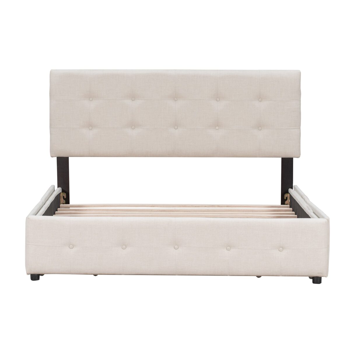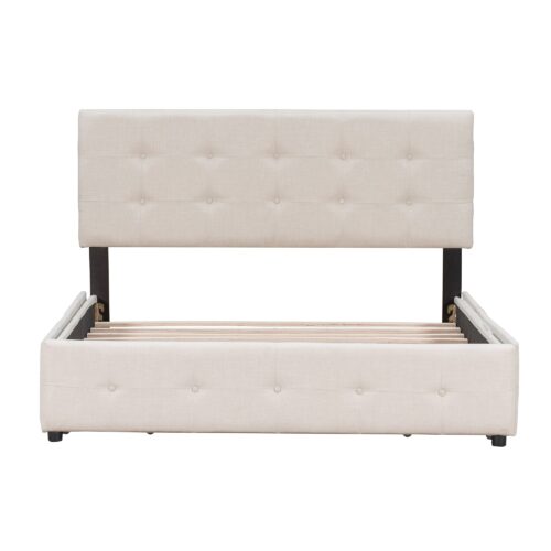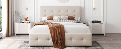 This beautiful Upholstered Platform Bed features button tufted upholstered headboard that adds a contemporary chic look to your bedroom and filled in thick foam to add extra comfort. Sturdy wood frame construction and a wooden slat system to add extra stability and safety. Despite its size and solidity, this piece comes with hardware and instructions included and anyone can assemble it, without a problem. The upholstered platform bed with four drawers can easily be pulled in and out for maximum storage space, perfect for organizing anything from clothes and bed linens to toys and games.