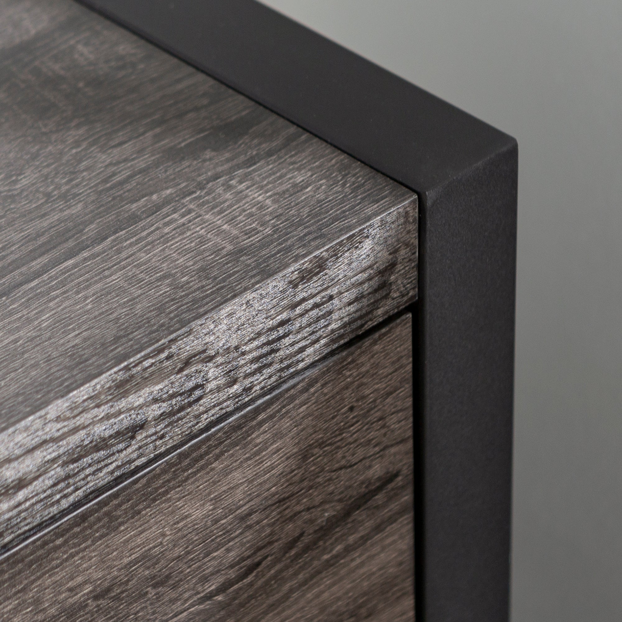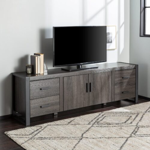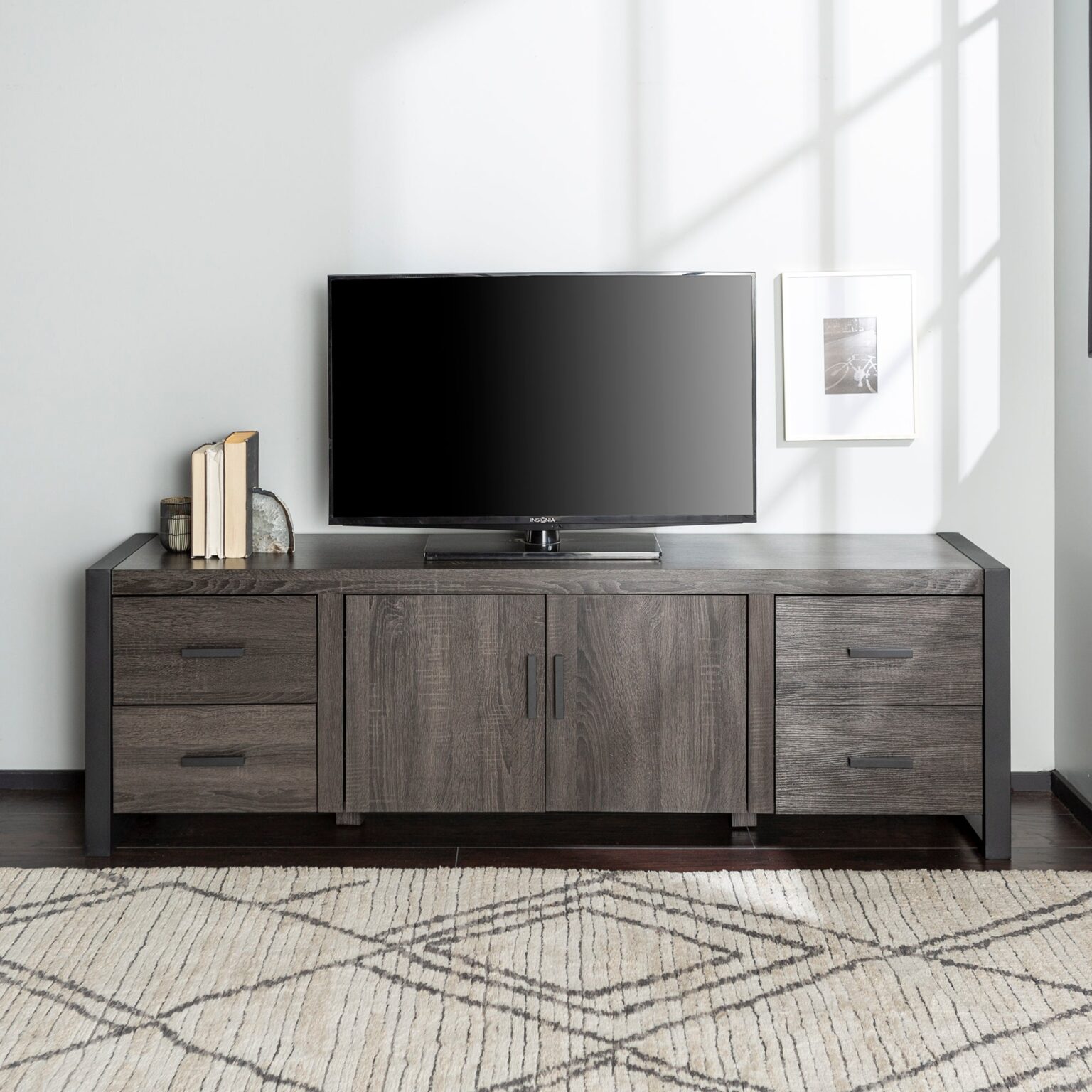 Design your ideal living room with style and storage in mind, with our TV stand. Featuring closed storage by having four side drawers and middle cabinet space, you’ll have plenty of room to keep your electronics and media inside. This entertainment center has metal side legs and handles to contrast against the durable laminate composition, giving it an urban industrial style. You’ll enjoy having a more organized living room with this console.