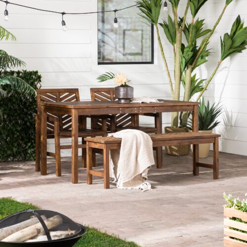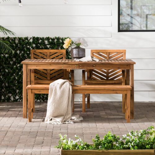 One part table, one part bench and two parts chair, this four-piece patio set is the perfect recipe to achieve your outdoor dining dreams. This solid acacia wood dining set is weather resistant and sturdy. The table features an umbrella hole so you can still enjoy eating in your backyard with some shade coverage. Both the chairs and bench have an engaging chevron slat design that would complement any number of outdoor designs.