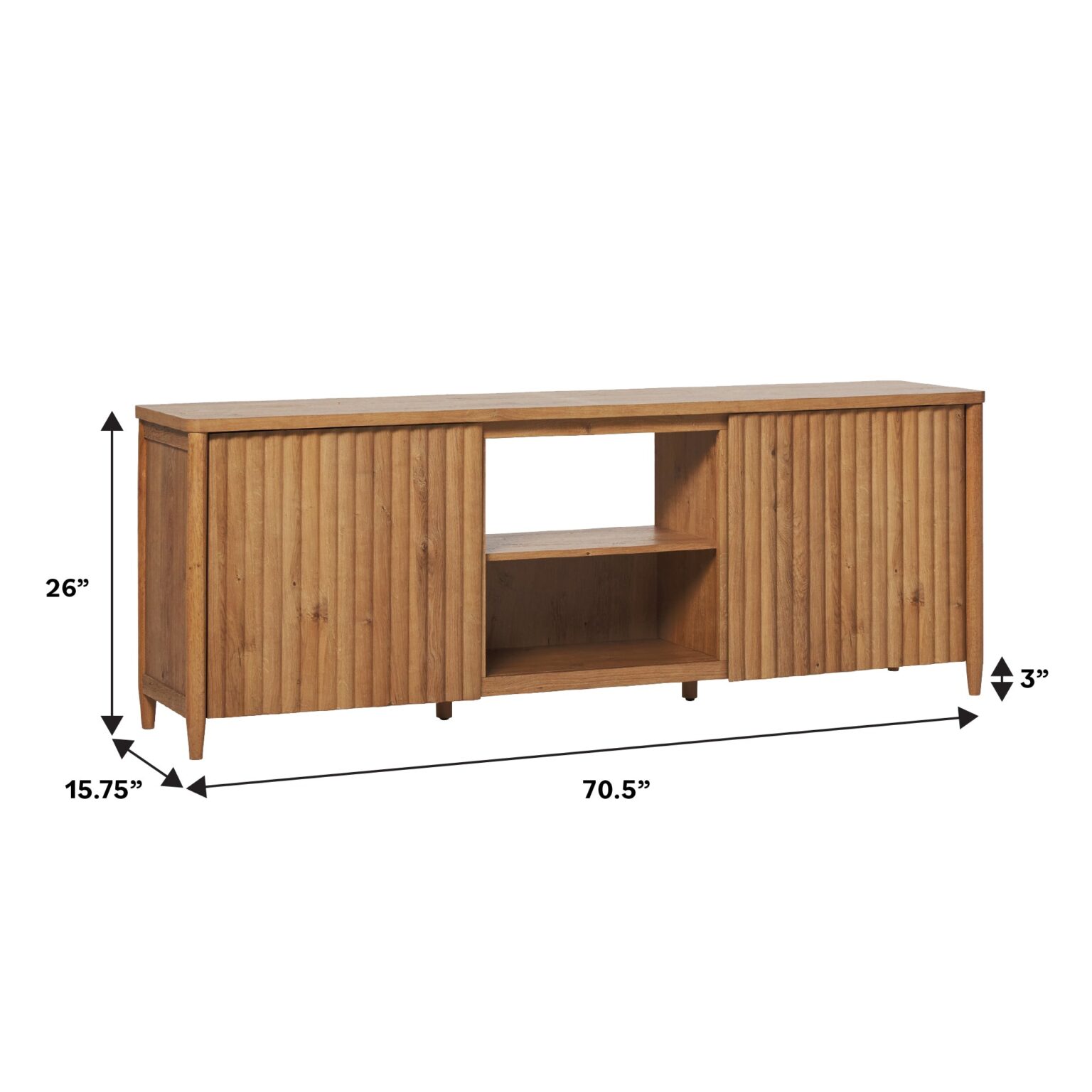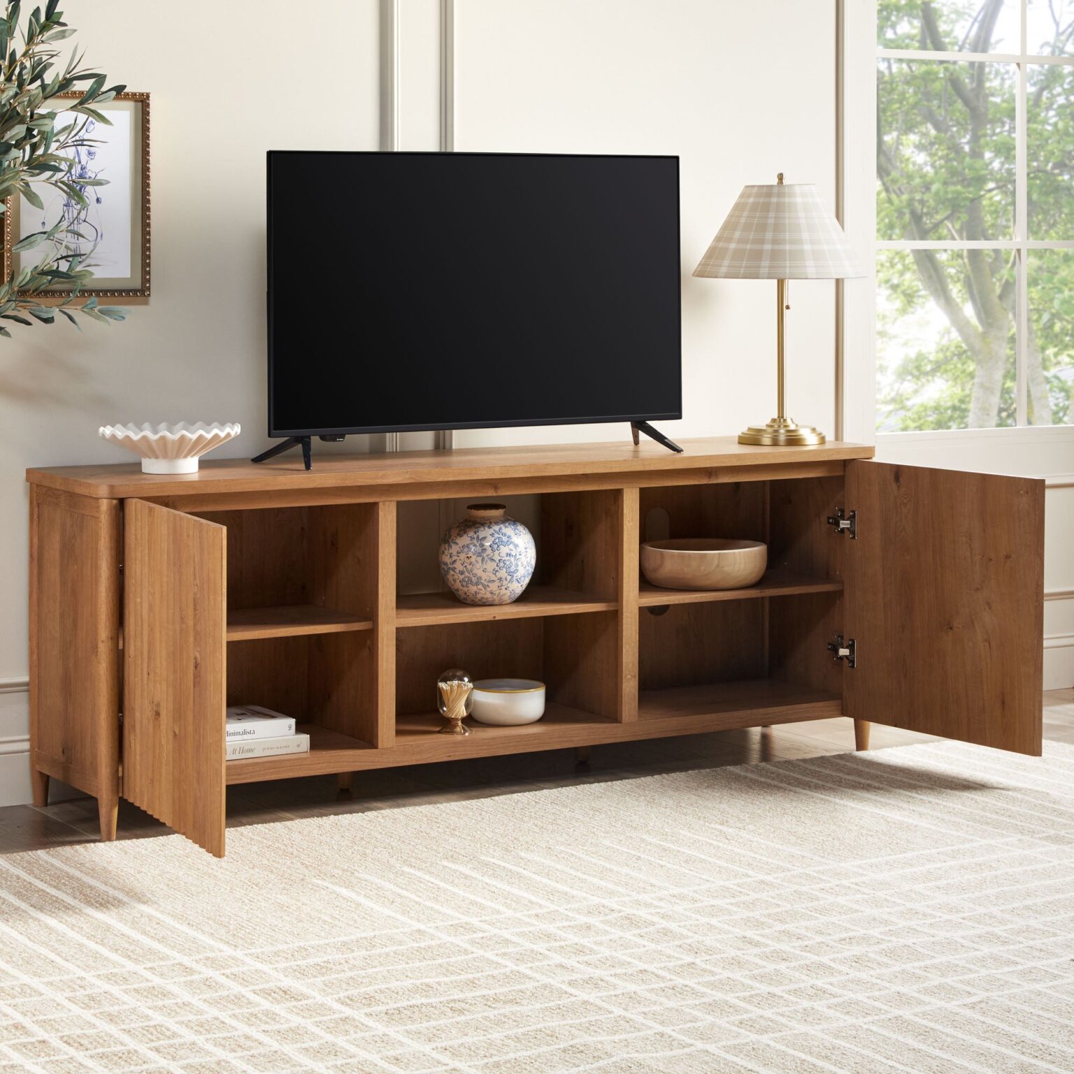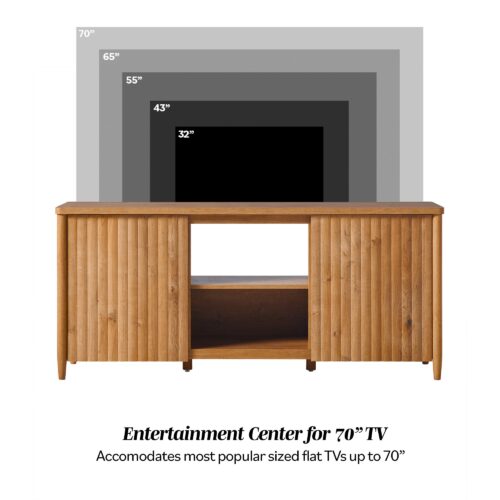 Give your space a modern upgrade with a TV stand that blends style and function. Textured fluted doors add depth and sophistication, creating a standout statement piece. Spacious shelves keep media devices, gaming consoles, and décor neatly organized. Crafted from high-quality materials, it supports TVs up to 70″ and 80″ with lasting durability. A scratch-resistant surface handles daily wear, while built-in cord management keeps cables hidden for a sleek, clutter-free look. Effortlessly stylish and practical, this stand is designed for modern living.
